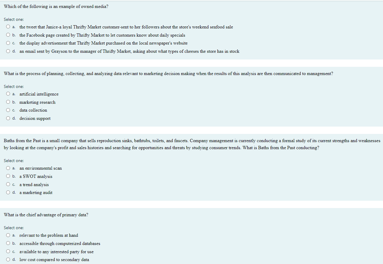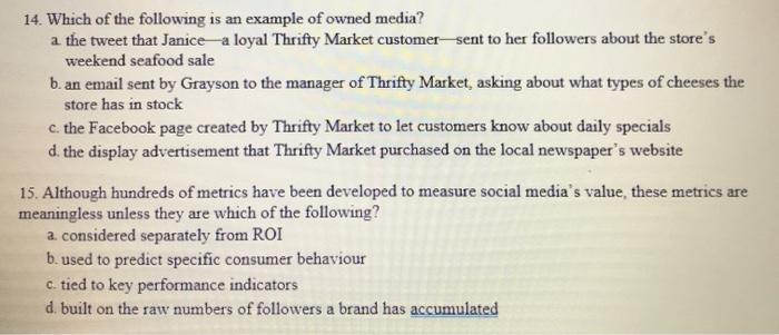 The tweet that Janice-a loyal Thrifty Market customer-sent to her followers about the stores weekend seafood sale O b. Which of the following is an example of owned media. Which of the following is an example of owned media.